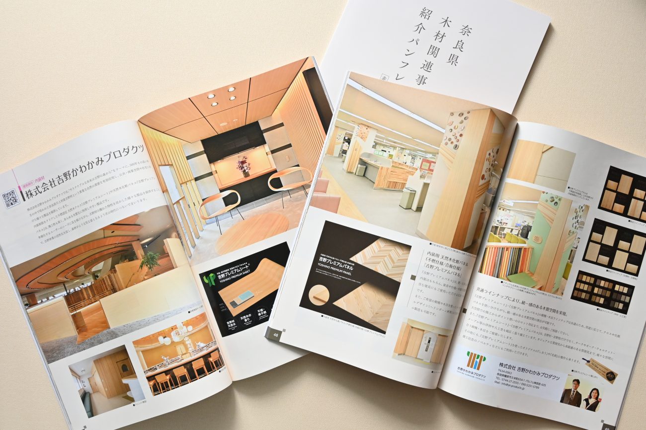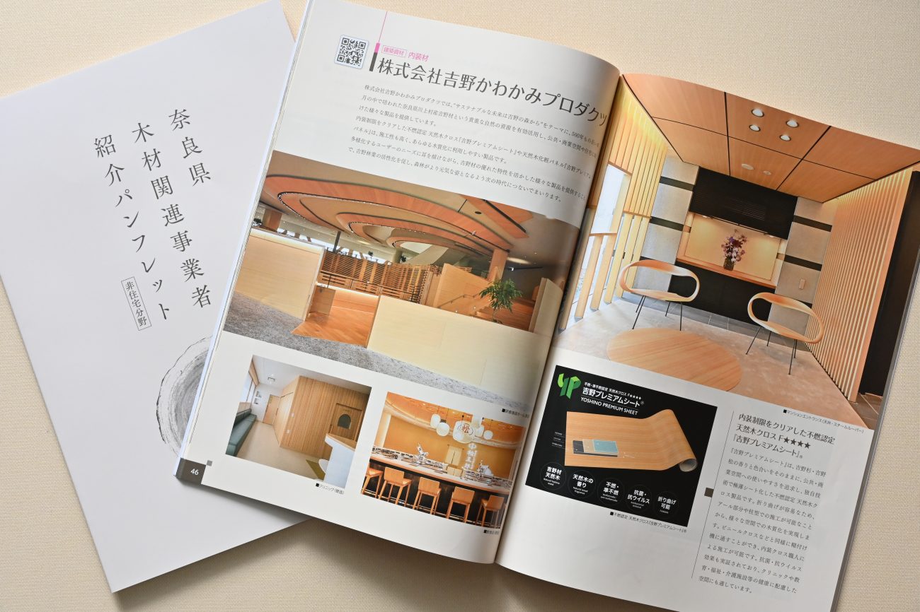 弊社の公共・商業空間向け木質内装建材『吉野プレミアムシート』・『吉野プレミアムパネル』が、奈良県 県産材利用推進課が発行する『木材関連事業者紹介パンフレット(非住宅分野)』に掲載されました。