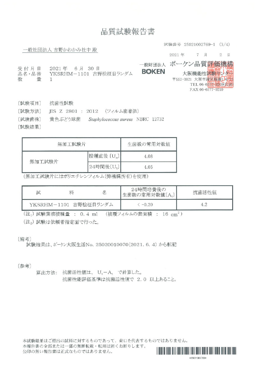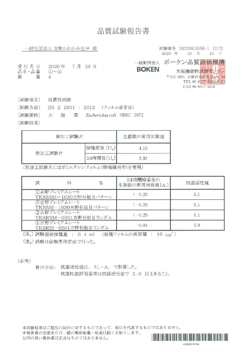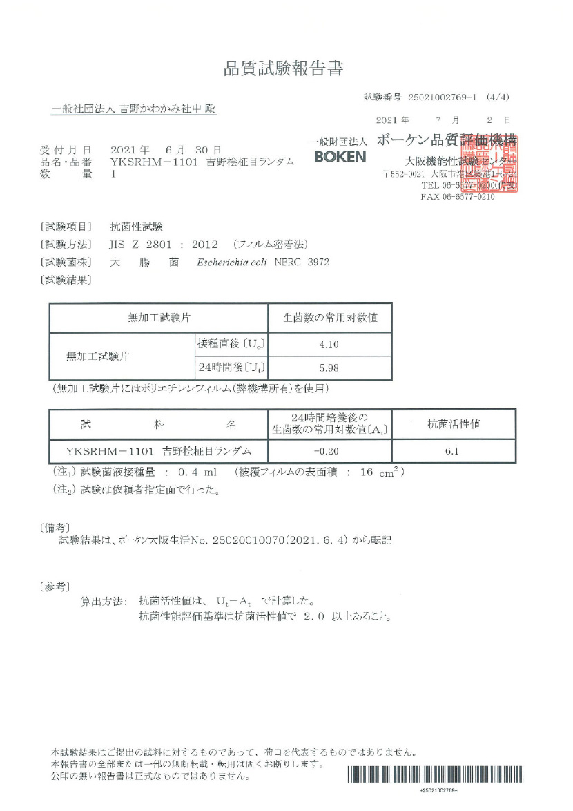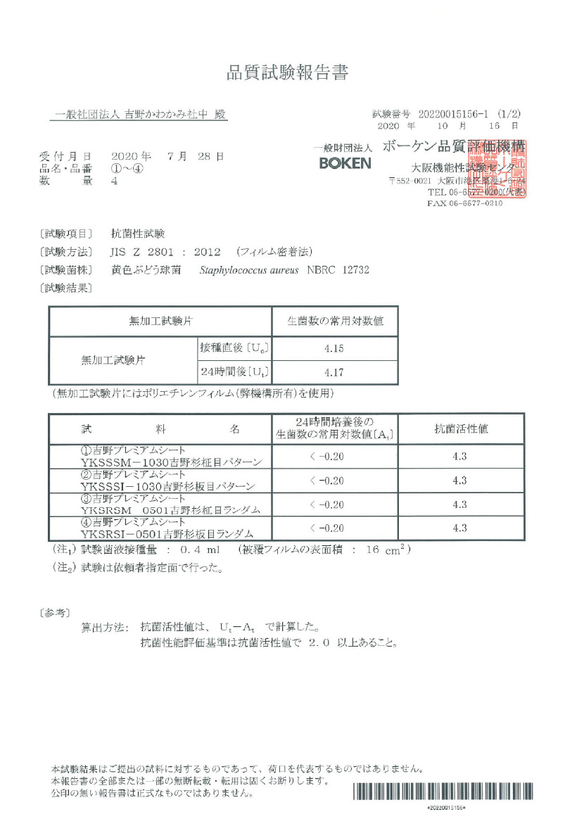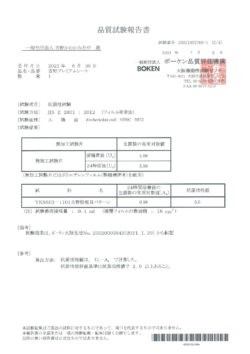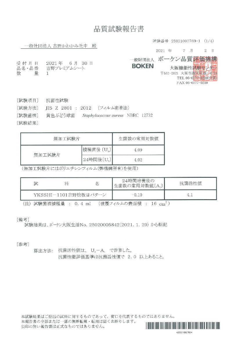 JNLA登録試験所において、吉野プレミアムクロス/シートの表面にJIS Z 2801抗菌性試験を実施したところ、 抗菌性の基準を満たし、黄色ぶどう球菌と大腸菌を抑制する効果が実証されました。これにより、抗菌剤を使わない天然素材製品による抗菌効果が期待できます。(感染防止、防汚、防カビ、防臭などの副次的効果を訴求するものではありません)