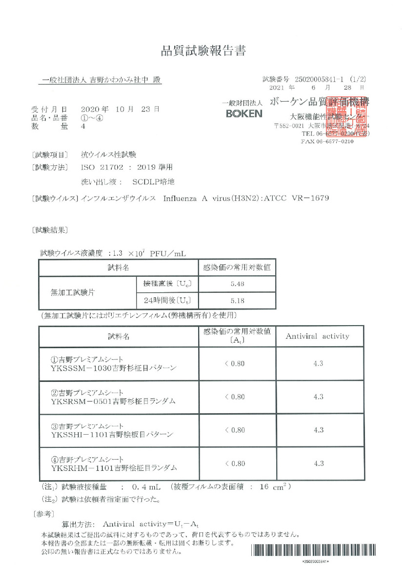 JNLA登録試験所において、吉野プレミアムクロス/シートの表面にISO 21702の抗ウイルス性試験を実施したところ、 抗ウイルス性の基準を満たし、インフルエンザウイルスを抑制する効果が実証されました。これにより、抗ウイルス剤を使わない天然素材製品による抗ウイルス効果が期待できます。(感染防止を訴求するものではありません)