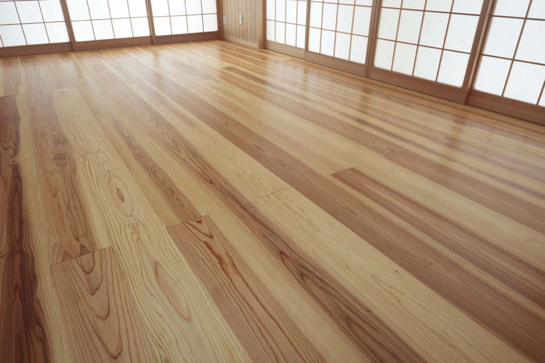 幅広で、節がほとんど無い吉野杉の床板。夏はサラっと、冬は冷たさが感じにくい快適な素材です。