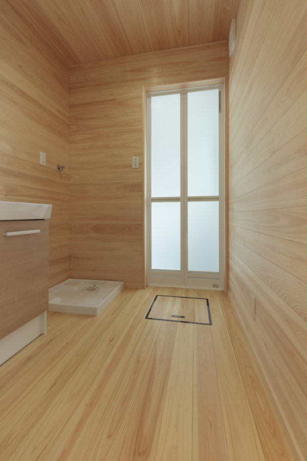 洗面所 兼 脱衣所 の水廻りの床には、水に強い桧を採用しました。